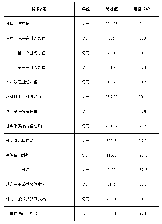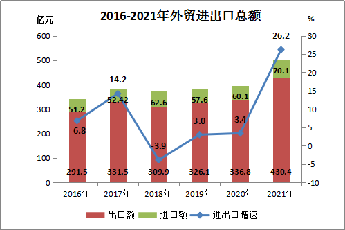全年外贸进出口总额500.6亿元,比上年增长26.2%。其中,进口70.1亿元,增长16.7%;出口总额430.4亿元,增长27.9%。新签合同外资11.45亿元,下降25.8%;实际利用外资2.98亿元,下降52.3%。