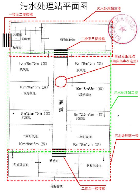 1.污水处理站位于永华纺织厂内,已取得《江门市排放污染物许可证》(江环证第220250号)。污水处理站的工艺流程是把浆纱车间漂染上浆后的污水统一收集到污水池(药物沉淀池),通过人工加药处理。加药后的污水先送到厌氧池进行初步分解,再送到一级好氧池分解,再次经过沉淀后,送到二级好氧池分解,最后经过钭管池和砂滤池沉淀后达标排放。污水处理站二楼一共有8个池,分别是4个生化池、2个厌氧池,还有2个中沉池,其中生化池和厌氧池规格相同,每个池的深度大约5米,长宽为10米*8米,池容积约400m3。中沉池的长宽为8米*2.5米,高为5米。8个池对称分布在中间走道的两侧,依次为厌氧池、生化池、中沉池、生化池,其中厌氧池靠近上三楼楼梯的位置。污水处理站平面图和现场图参见图1~5。