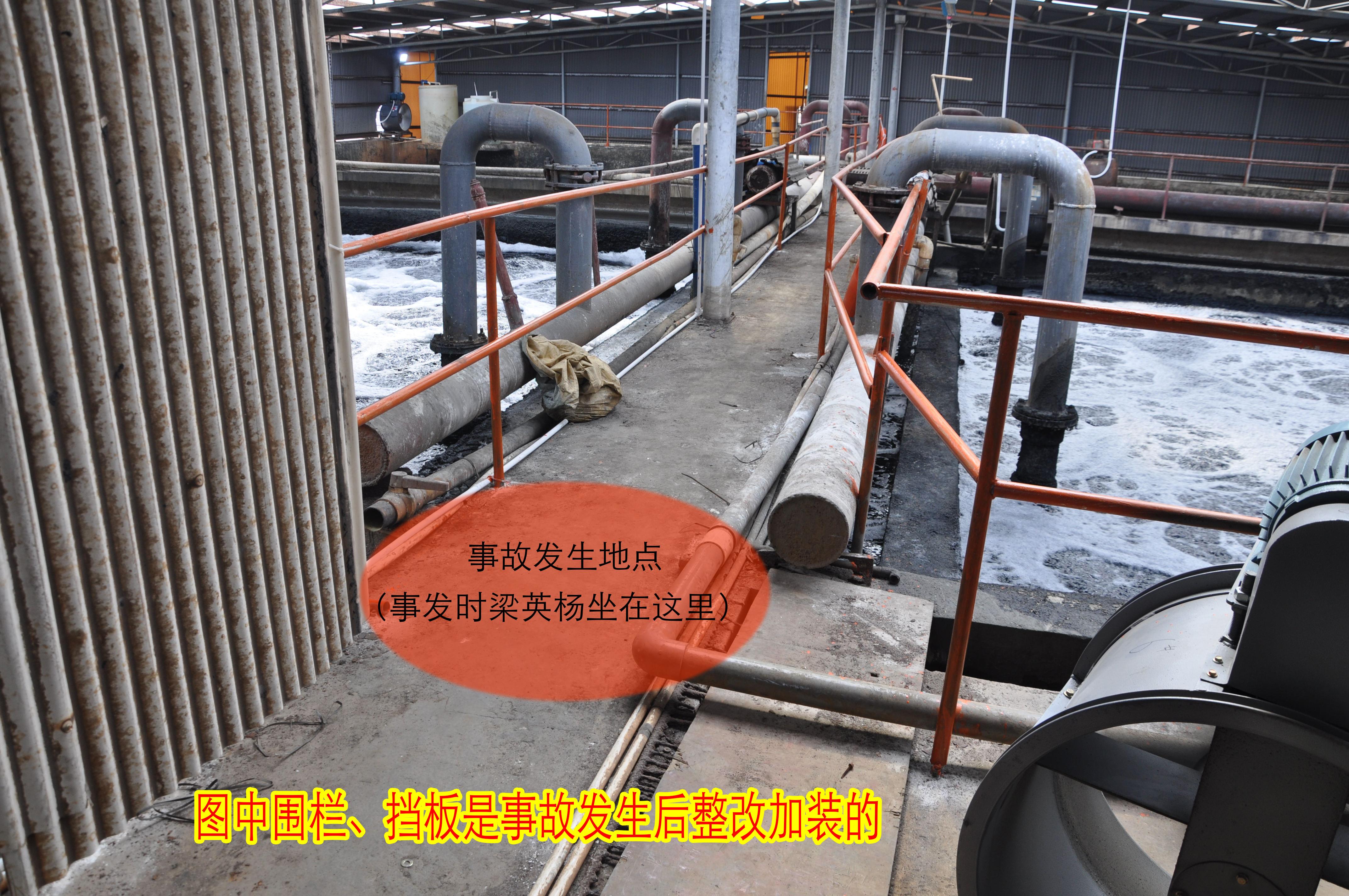 (1)事发地点各污水池之间的通道未装设防护栏设施,容易引发人员失足跌落污水处理池淹溺的危害。
