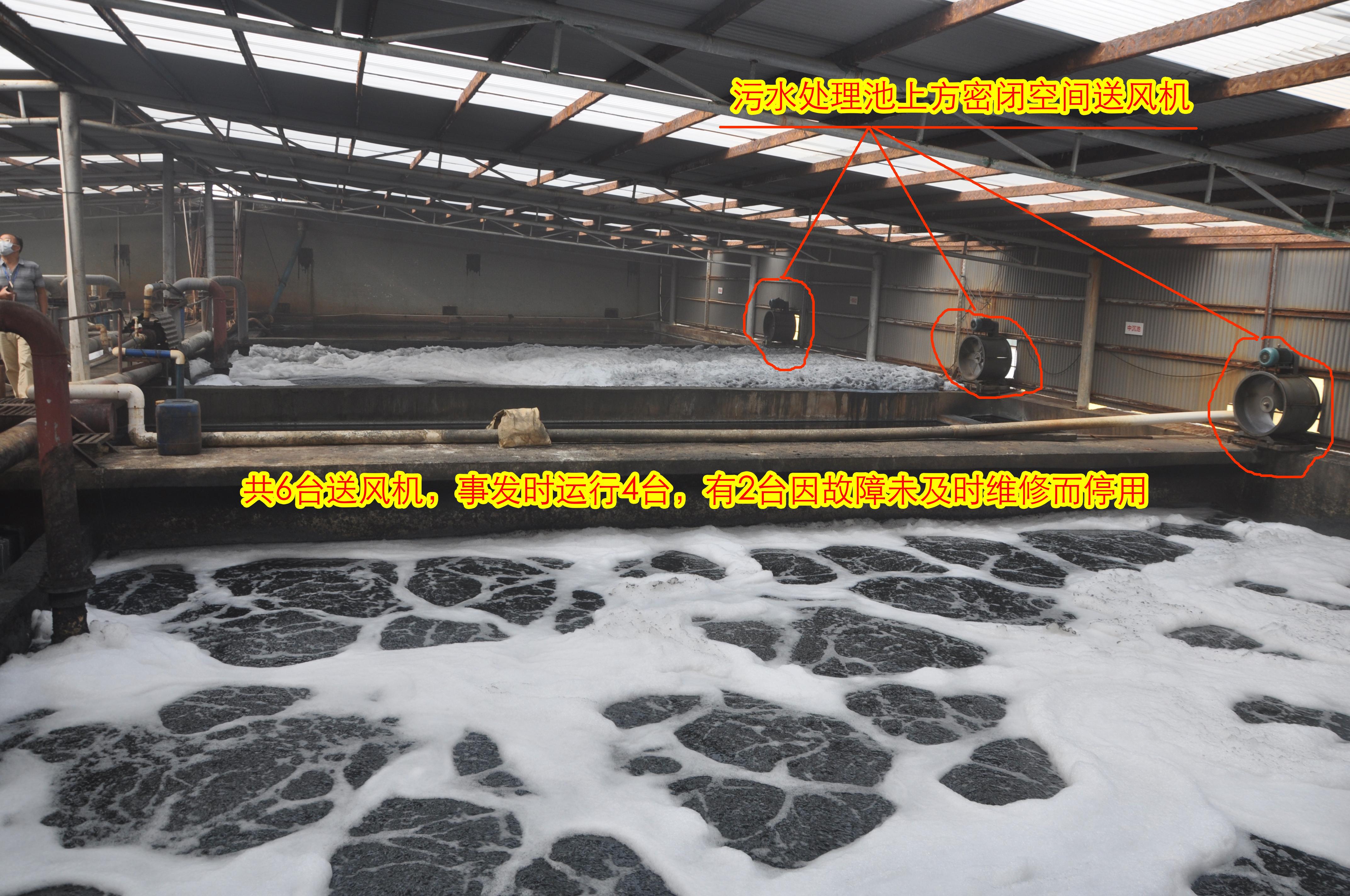 3.应环保排放的要求,永华纺织厂在污水处理池周围进行密闭,以便对散发出来的有毒有害气体进行收集处理。污水处理池密闭范围内有6台送风机,事故当天只运行4台,有2台因故障未及时修理而停用。污水处理池密闭后,按环保设计要求需安装两套抽风系统抽取密闭空间内的有毒有害气体进行过滤吸收等环保处理。现阶段只装设了一套抽风系统,另一套未装设。
