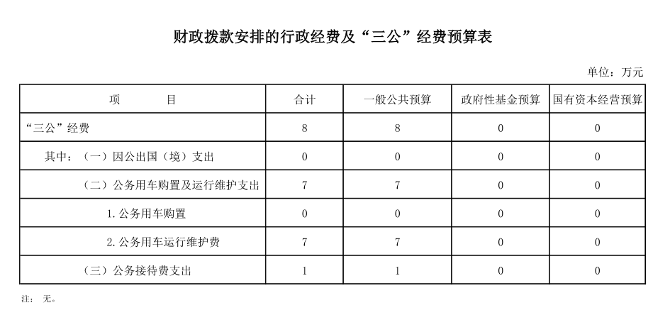 2023 年本部门财政拨款安排“三公”经费8 万元,比上年增加0 万元,增长0 %,主要原因是与上年持平,无增减变化 。其中:因公出国(境)费0 万元,比上年增加0 万元,增长0 %,主要原因是与上年持平,无增减变化 ;公务用车购置及运行费0 万元(公务用车购置费0 万元,比上年增加0 万元;公务用车运行维护费7 万元,比上年增加3 万元。)比上年增加3 万元,增长75 %,主要原因是车龄长,使用频密,车况较差,维修费用增大 ;公务接待费1 万元,比上年减少3 万元,下降75 %,主要原因是本部门厉行节约,节减运行经费 。