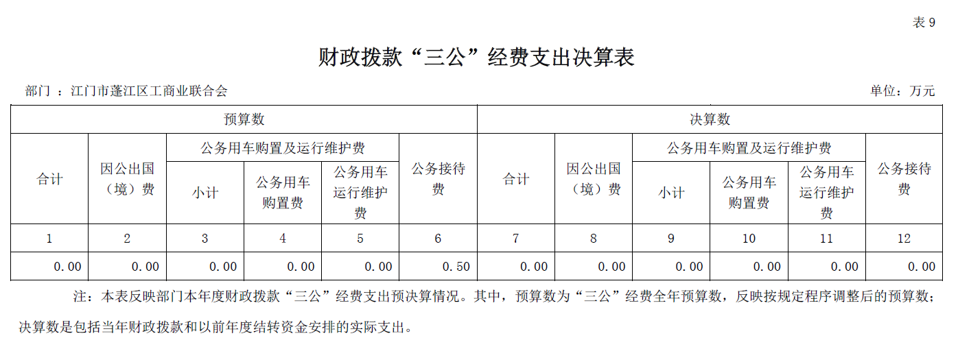 工商业联合会2022 年度“三公”经费财政拨款支出决算为0 万元,完成全年预算0.50 万元的0% ,比上年决算数减少0.15 万元,下降100% 。其中:因公出国(境)费支出决算为0 万元,完成预算0 万元的--%(基数为0,不可比) ,比上年决算数增加0 万元,增长--(基数为0,不可比) ;公务用车购置及运行维护费支出决算为0 万元,完成预算0 万元的--%(基数为0,不可比) ,比上年决算数减少0.06 万元,下降100% ;其中:公务用车购置支出决算为0 万元,完成预算0 万元的--%(基数为0,不可比) ,比上年决算数增加0 万元,增长--(基数为0,不可比) ;公务用车运行维护费支出决算为0 万元,完成预算0 万元的--%(基数为0,不可比) ,比上年决算数减少0.06 万元,下降100% ;公务接待费支出决算为0 万元,完成预算0.50 万元的0% ,比上年决算数减少0.1 万元,下降100%。