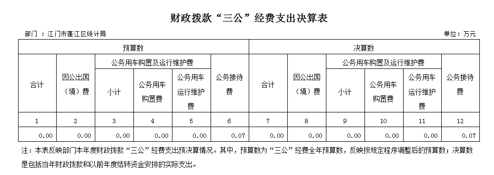 统计局2024 年度“三公”经费财政拨款支出决算为0.07万元,完成全年预算0.07万元的100%(基数为0,不可比) 。其中:因公出国(境)费支出决算为0 万元,完成预算0 万元的--%(基数为0,不可比) ;公务用车购置及运行费支出决算为0 万元,完成预算0 万元的--%(基数为0,不可比) ;公务接待费支出决算为0.07 万元,完成预算0.07万元的100%(基数为0,不可比) 。
