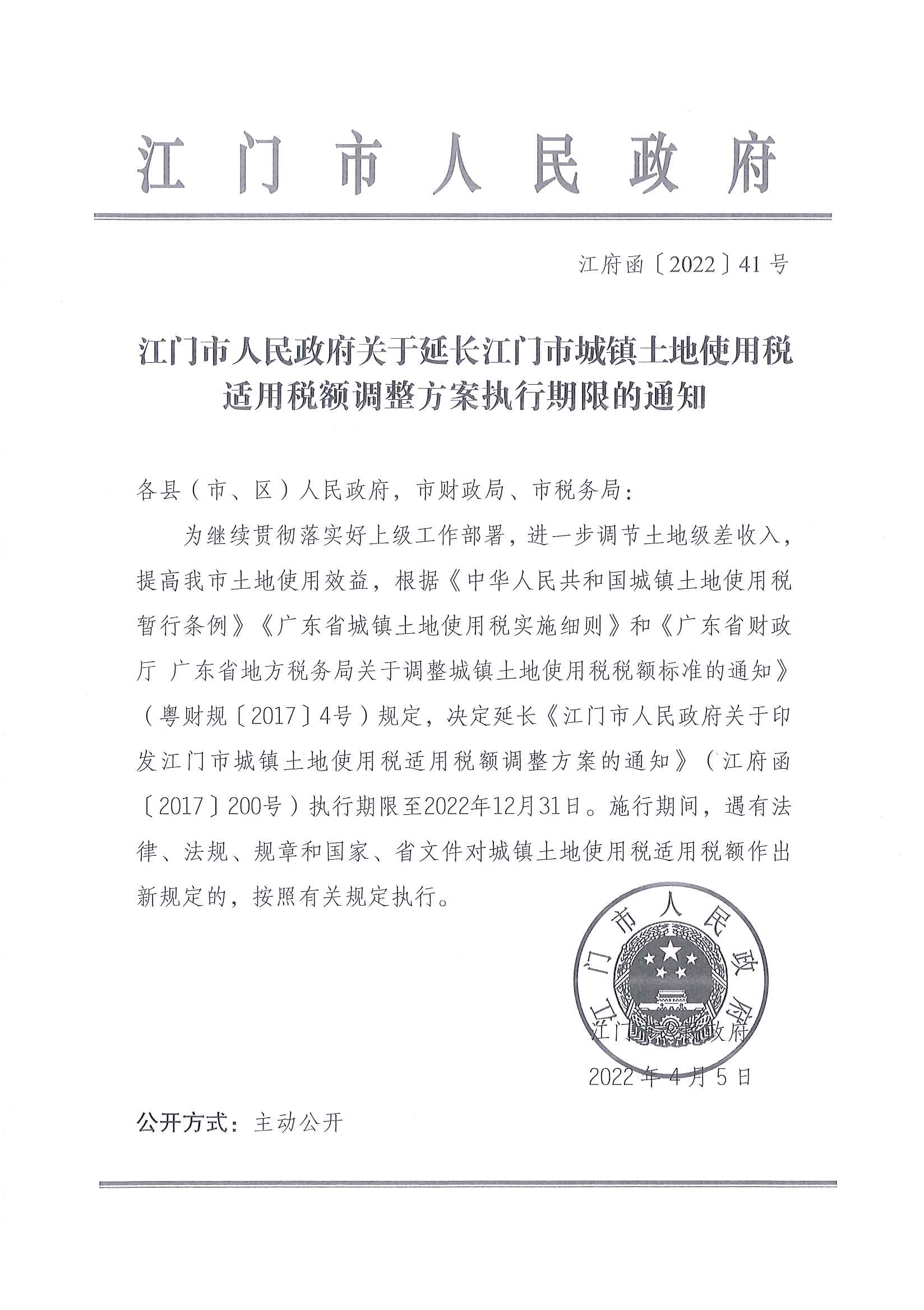 江门市人民政府关于延长江门市城镇土地使用税适用税额调整方案执行期限的通知