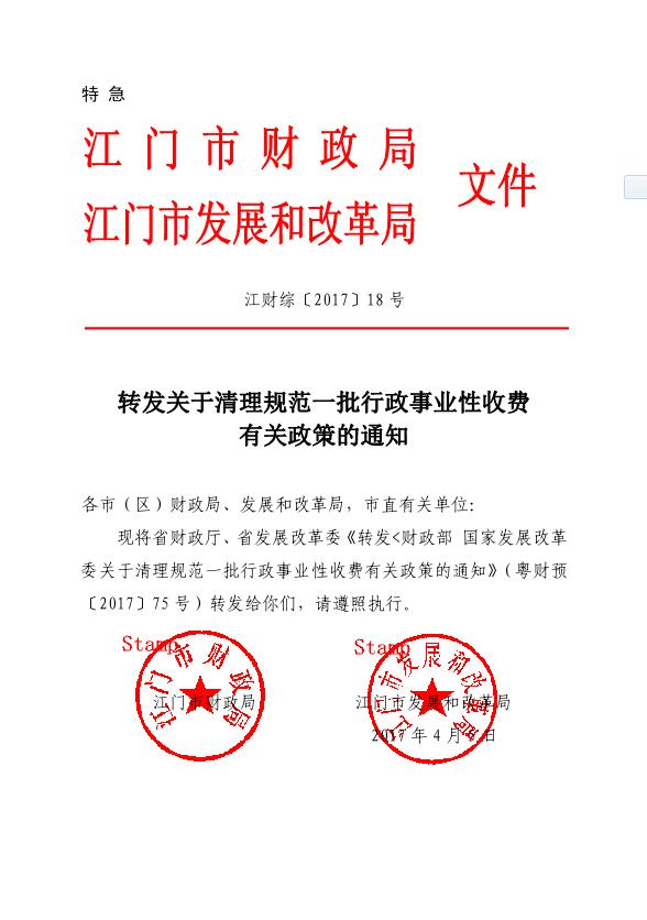 转发关于清理规范一批行政事业性收费有关政策的通知 江财综[2017]18号