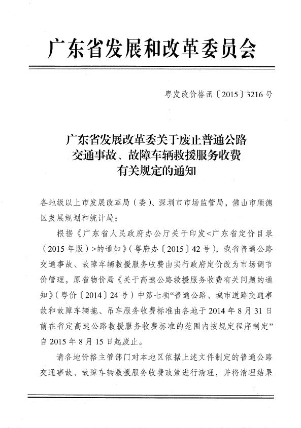 广东省发展改革委关于废止普通公路交通事故、故障车辆救援服务收费 江发改费管[2015]0702号