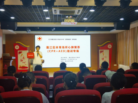 白沙兴盛社区卫生服务中心培训师资莫梅先主讲。授课老师从红十字会知识开始讲起,引出红十字会主要职能之一“应急救援”,通过深入浅出的理论知识讲解和现场示范操作,配合生动的案例视频,使学员们对心肺复苏、AED的操作有一定的了解,再通过现场理论考试和实操考核,让学员们基本掌握此项运动中的救命技能。