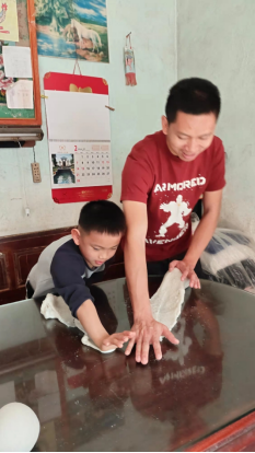 ▲棠下镇横江小学学生刘梓枫与爸爸一起制作棠下特产年货——“寒提”。