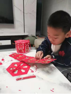 ▲紫沙小学三年级学生唐何美思剪纸花迎新年