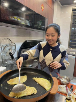 ▲发展小学六年级学生朱欣怡与妈妈一起做老家新年必吃的美食——春卷