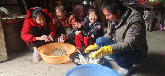 ▲荷塘镇良山小学学生唐微香(左)在与家人其乐融融地叠豆腐