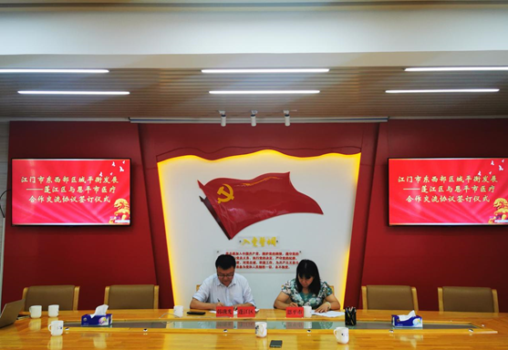 为深入贯彻习近平总书记关于区域协调发展的重要论述,落实江门市第十四次党代会精神和市委关于推动江门东西部区域平衡发展的部署要求,根据区委、区政府的工作部署,加强蓬江、恩平的对接力度,2022年6月16日,蓬江-恩平两地医疗卫生合作签约交流会在恩平顺利举行。两地就加强疫情防控经验交流、开展区域医疗管理及技术互派交流等方面达成一致意见,并签订《春雨直播