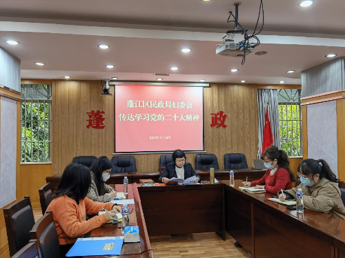 近日,区民政局妇委会召开会议,专题传达学习党的二十大精神及相关会议精神。区民政局三级主任科员、妇委会主任李洁凌同志主持会议并发表讲话,妇委会全体成员参加会议,并结合工作实际进行交流发言。