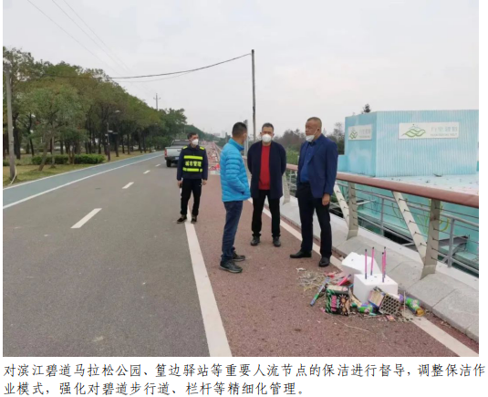1月21日至27日,蓬江城市管理和综合执法局对城区主次干道、滨江大道、三镇一街、碧道、公园出动巡查和管理人员约1000人次,车辆约70台次,日均出动环卫工人约2500人,日均出动养护车、三轮电动保洁车等各式环卫车辆约900台,日均清理明渠约100条,累计清运生活垃圾约5000吨。