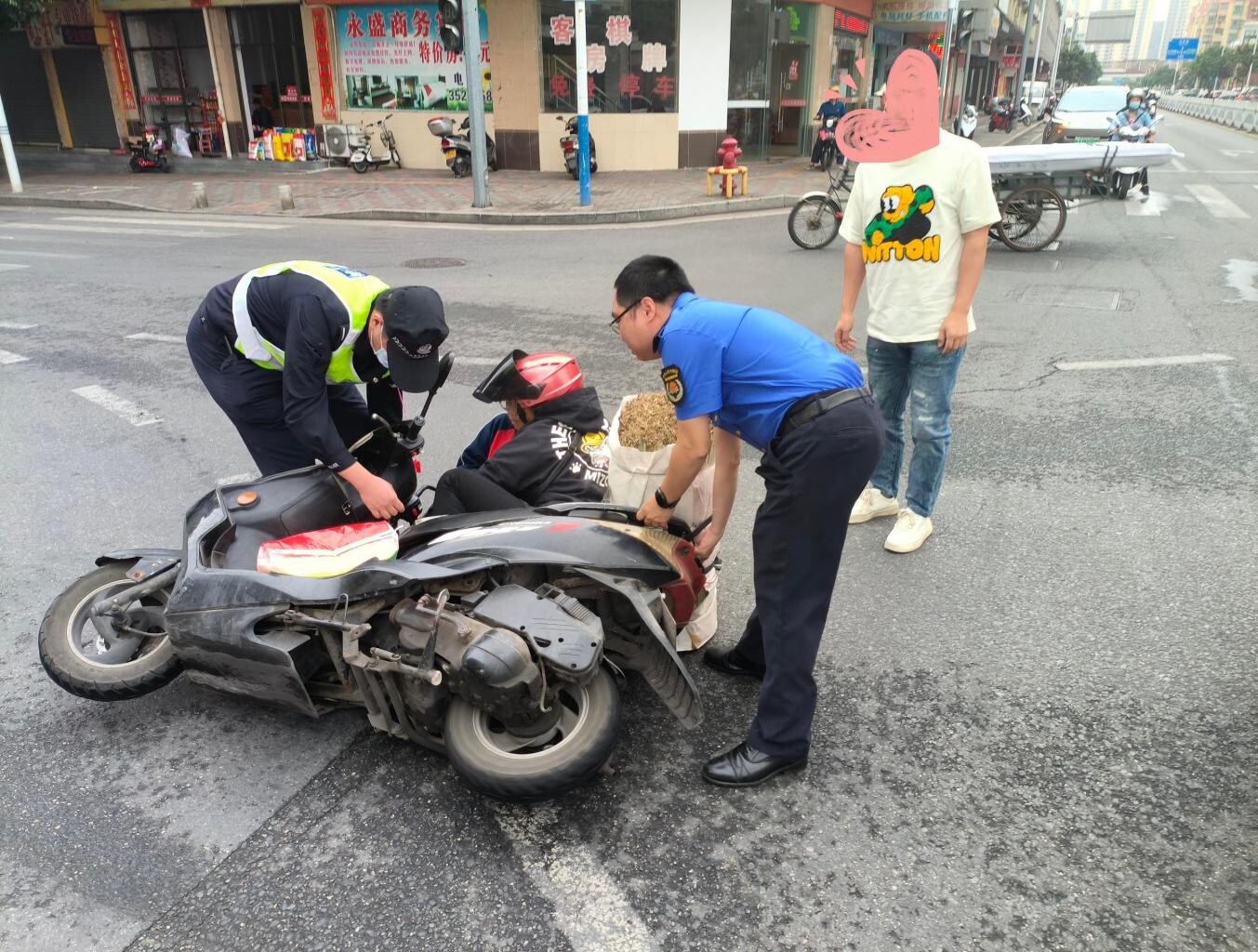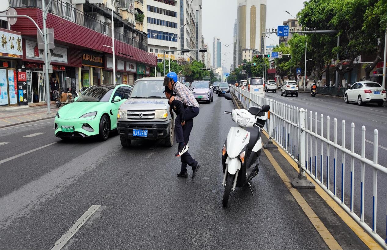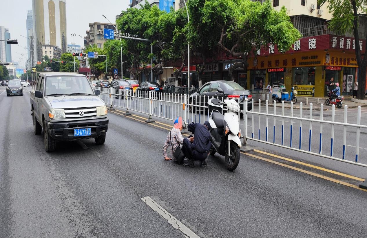 同一时间,暖心的一幕也在另一头上演着。另一组队员梁健能在值守远航市场期间,巡查至永盛二路,发现一女子驾驶摩托车发生交通事故。