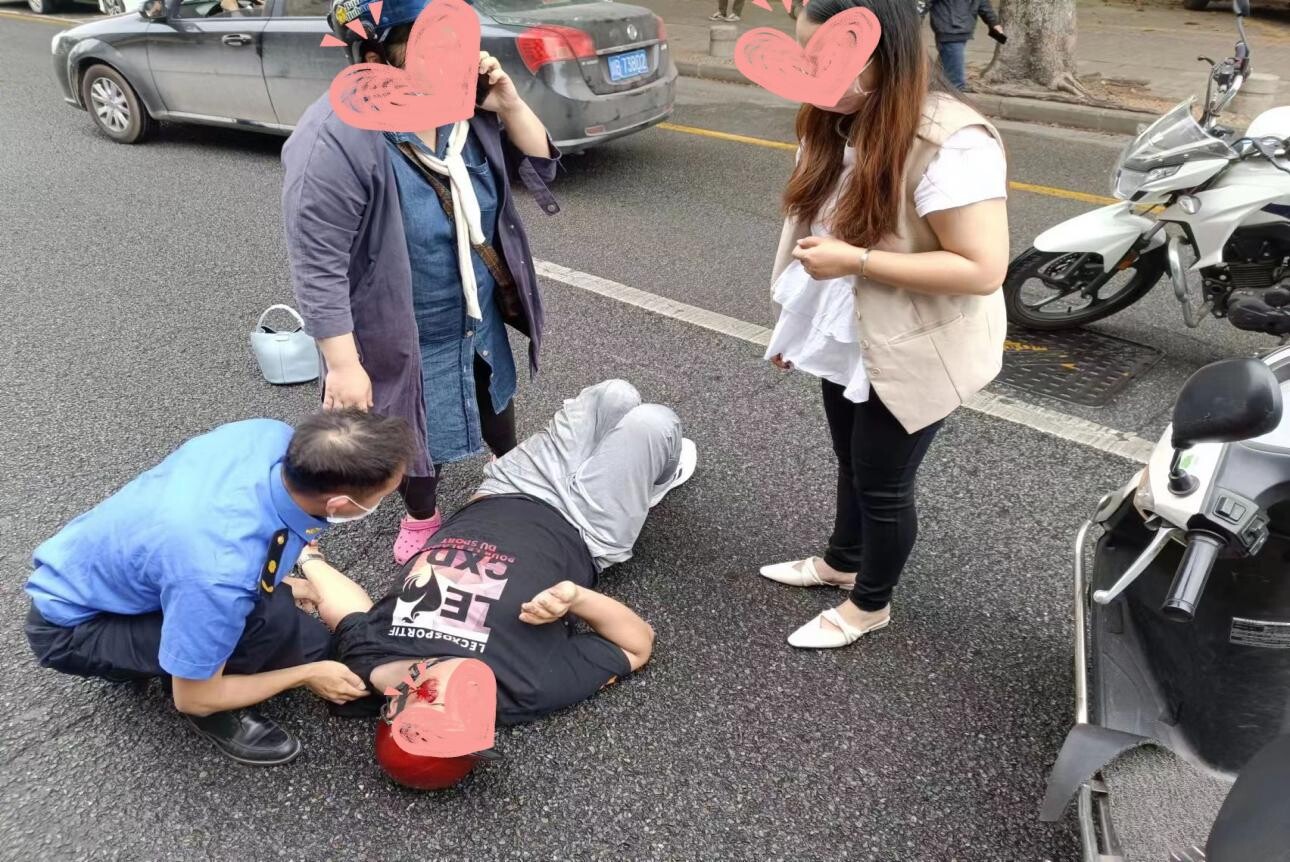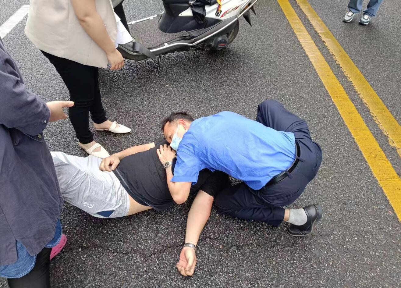 得知家属已拨打120急救电话,陈毅勇在做好现场录像和指挥交通并拨打110电话,徐龙友则检查伤者脉搏、心跳等情况,并采取心肺复苏措施、与伤者保持对话等,试图唤醒意识模糊的伤者,并安抚一旁的家属情绪。