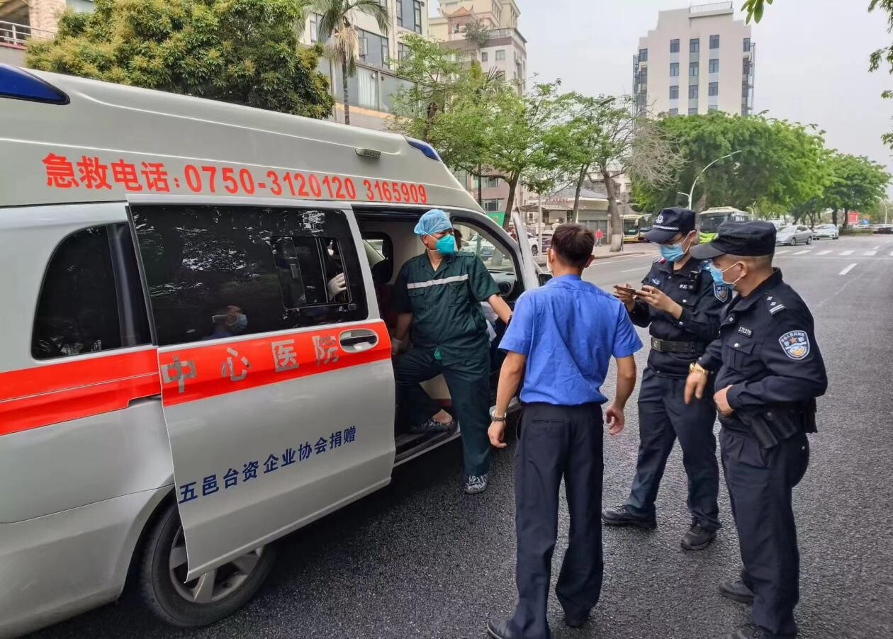 3月18日上午10时30分,徐龙友、陈毅勇两名队员巡查至春雨直播 海傍街时,发现一男士驾驶摩托车发生交通事故,受伤倒地,意识模糊。