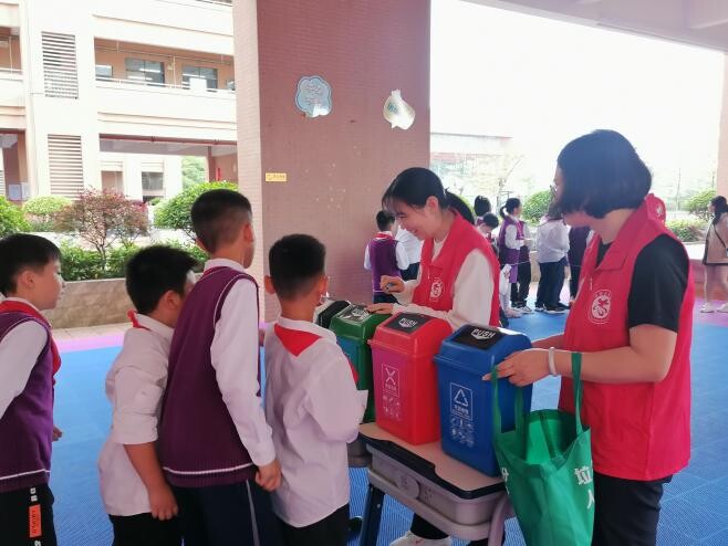 现场活动中,工作人员给同学们上了一堂别开生面的垃圾分类普法知识讲座,从垃圾来源及污染危害、垃圾四分类、分类处理流程及方法、源头减量和垃圾分类相关政策法规等方面进行讲解,中间还设置了有奖抢答环节,激发了同学们的听讲兴趣,深化了学习的效果。