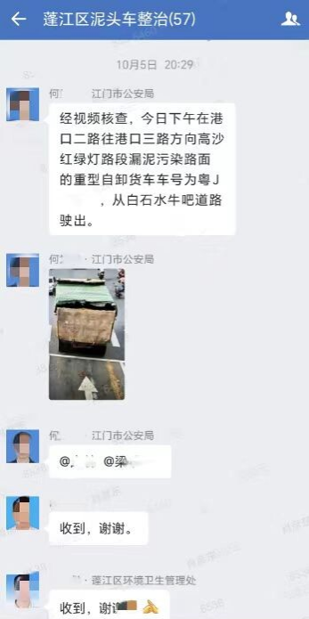 经交警部门调查发现,锁定一辆厢式四轴运输车(车牌号粤JU3XXX)。该车辆涉嫌违反《中华人民共和国大气污染防治法》第七十条“运输煤炭、垃圾、渣土、砂石、土方、灰浆等散装、流体物料的车辆应当采取密闭或者其他措施防止物料遗撒造成扬尘污染,并按照规定路线行驶”的规定。蓬江城管已联系违法车辆所属公司及相关当事人进行立案调查,目前案件正在进一步办理中。