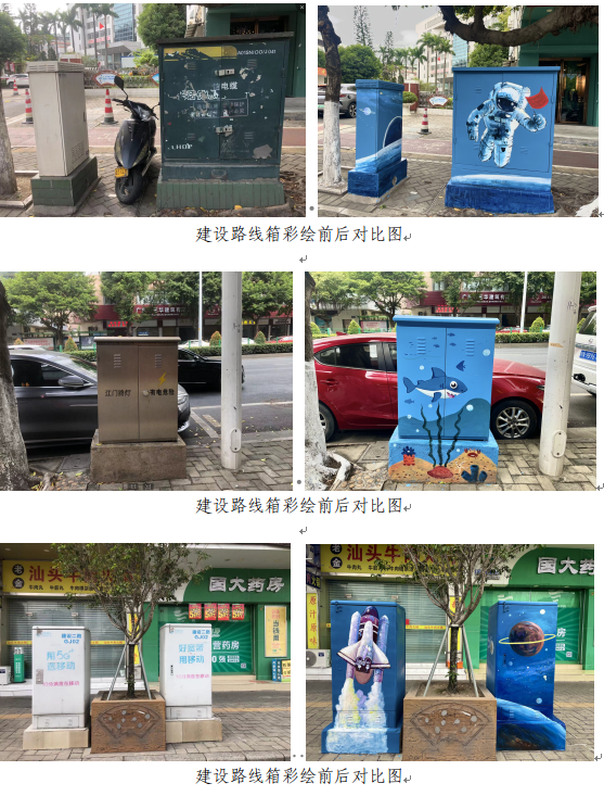 市民近日如果在建设路、跃进路、江华路上细心观察,就能发现路边多了很多色彩斑斓的彩绘,其实是矗立在街头的线箱经过精心设计后,一改往日单调灰暗的形象,摇身披上了主题鲜明、色彩缤纷的“彩衣”,成为蓬江这座文明城市的一道独特风景线。