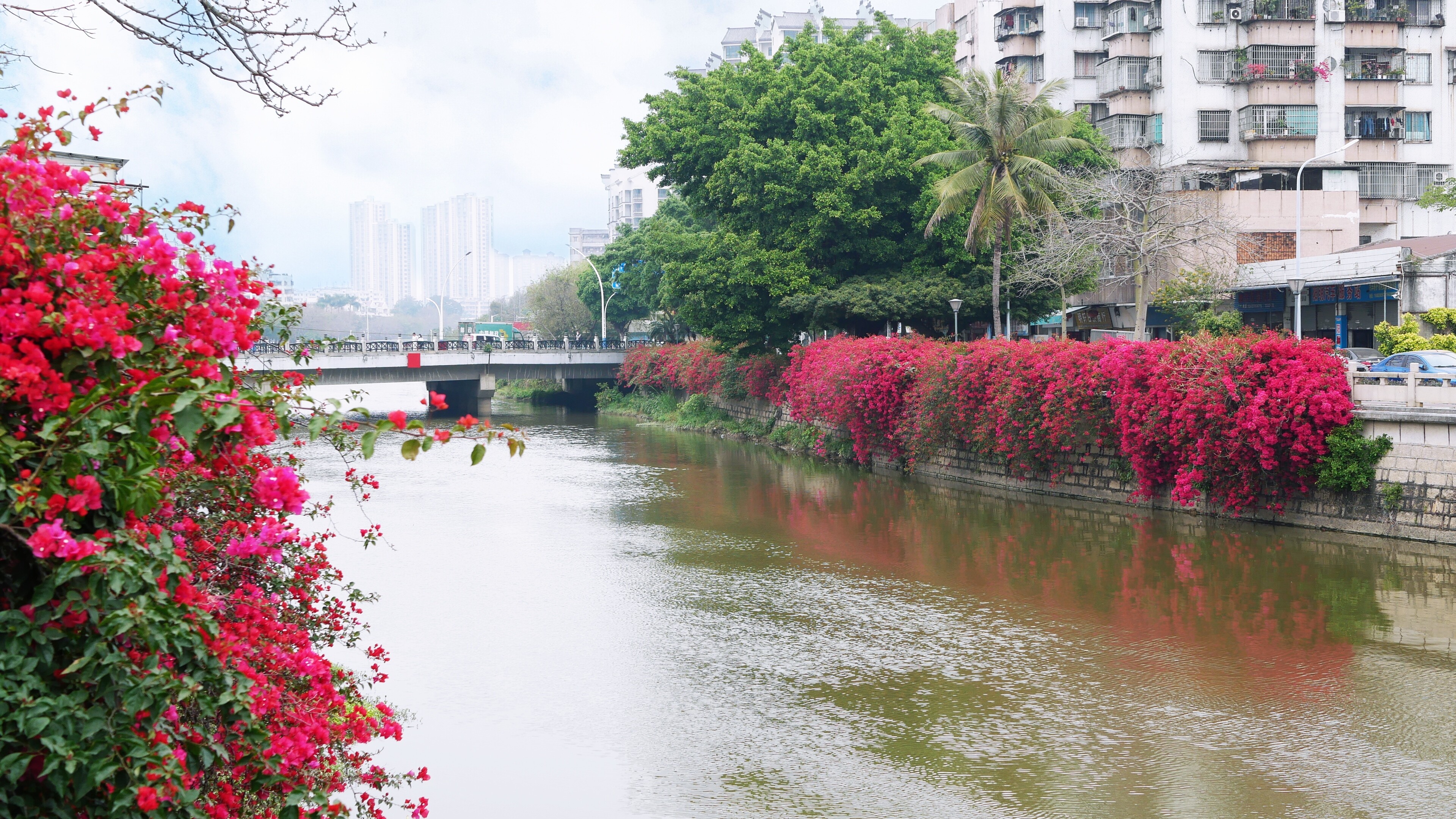 天沙河岸的簕杜鹃花团锦簇、随风摇曳,一抹紫红流淌进河中,成为别样明艳的“镜中花”。
