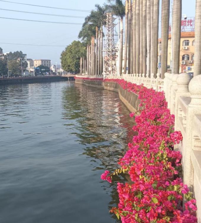 在杜阮河岸,一簇簇艳丽的簕杜鹃开满河岸,与绿树碧水相映成趣。据了解,杜阮镇鼓励村集体和村民参与绿化行动,大力开展绿美杜阮生态建设,在江杜中路、杜阮河岸种植人面子、蒲葵、大叶紫薇154棵、市花簕杜鹃800株,推动城郊森林化、道路林荫化,提高圩镇绿化景观,为绿美杜阮增添新魅力。