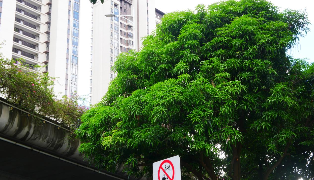 枝繁叶茂的绿化芒果树,为行人遮阳挡雨
