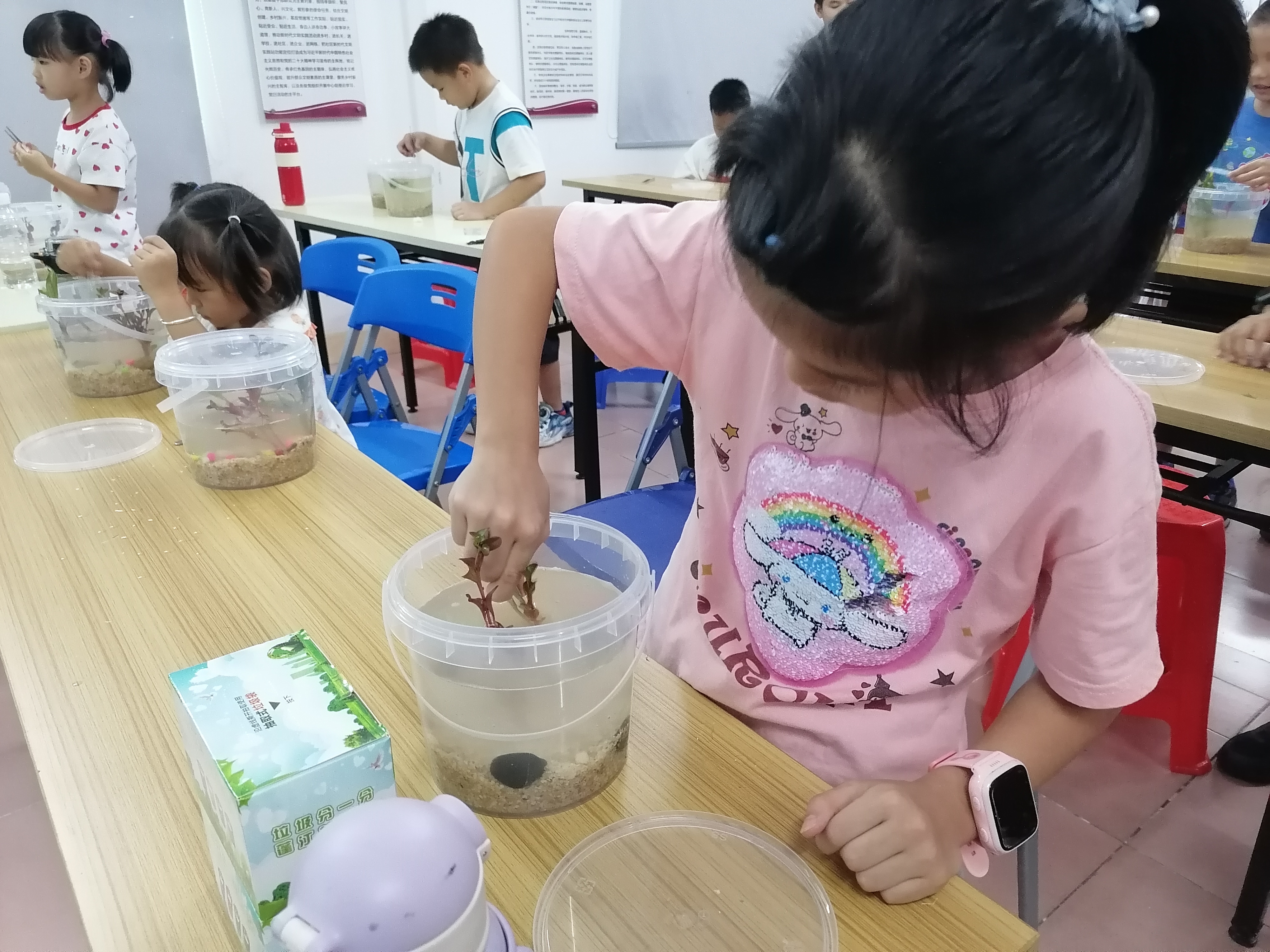 科普讲座结束后,就到了令人期待已久的“迷你生态鱼缸”DIY制作环节。“迷你生态鱼缸”通过合理搭配鱼类、水草、微生物等生物,以及适当的水质管理,模拟出一个稳定的可循环自然生态系统。