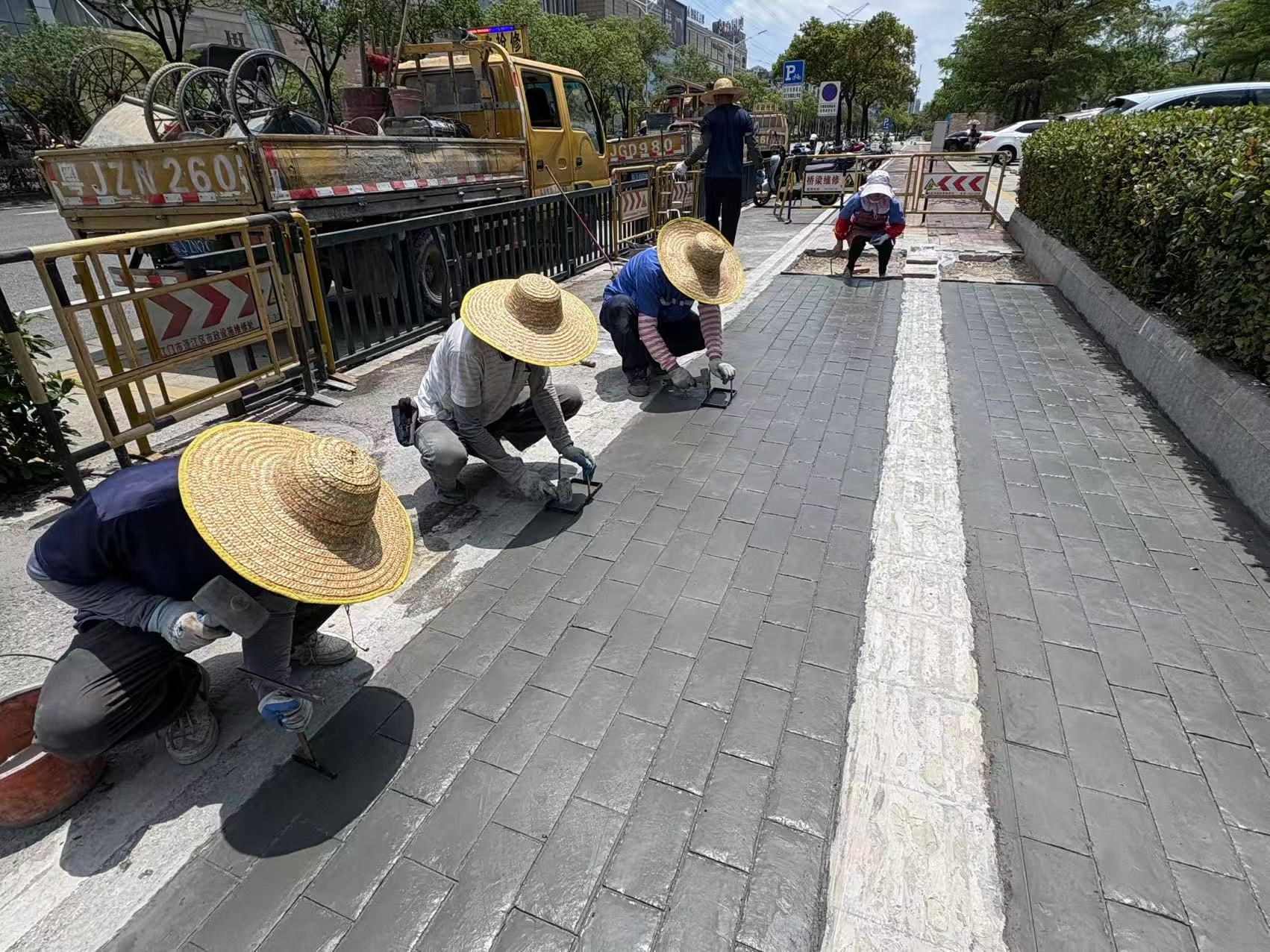 在江门市妇女儿童活动中心前,市政工人在烈日下紧张而有序地施工。根据周边道路设计样式,提前将烧焊拼接好的砖块模具按压在混凝土上。完工后,人行道路面与周边景观相协调,整体视觉效果良好。