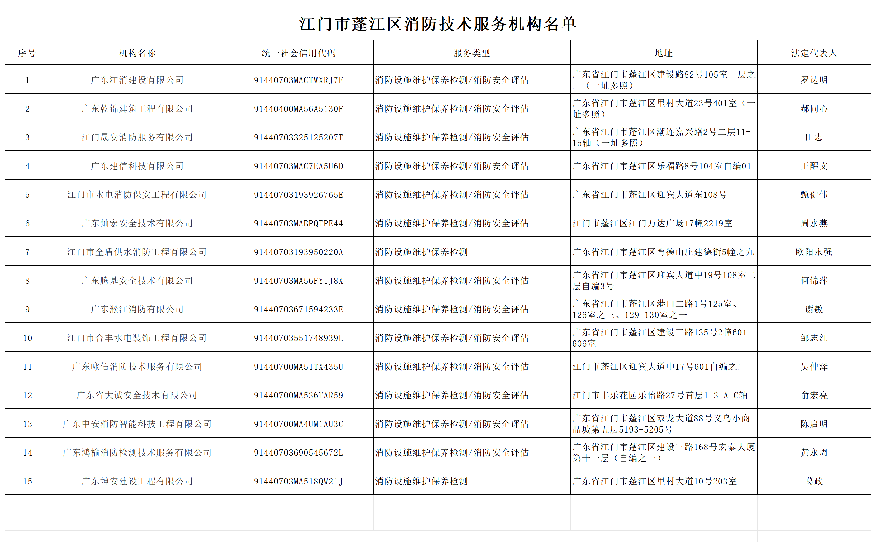 为方便广大社会单位和个人选用符合从业条件的消防技术服务机构,有效开展消防设施维护保养、消防安全风险评估、消防设施检测,为各行业部门开展消防工作提供优质技术服务,推进我区对消防技术服务机构的监督管理工作,提升专业指导效能,截至2024年3月31日,在我区工商登记,符合消防技术服务机构从业条件,并在广东社会消防技术服务信息平台录入相关执业信息消防技术服务机构共15家,现予以公示。