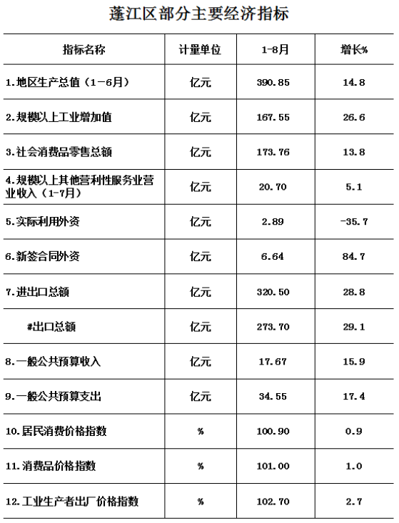 1-8月,全区规模以上工业增加值167.55亿元,同比增长26.6%。分经济类型看,国有及国有控股企业增长15.0%;外商及港澳台商投资企业增长18.0%。分企业规模看,大、中、小型企业工业增加值分别增长28.7%、27.1%、24.0%。全区工业用电量增长11.1%。