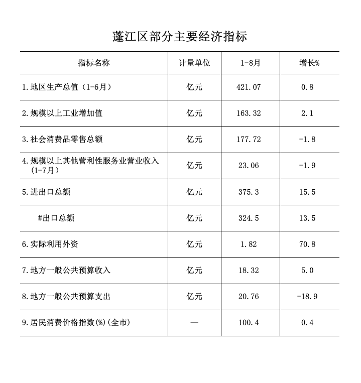 1-8月,全区地方一般公共预算收入18.32亿元,增长5.0%;全区地方一般公共预算支出20.76亿元,下降18.9%。