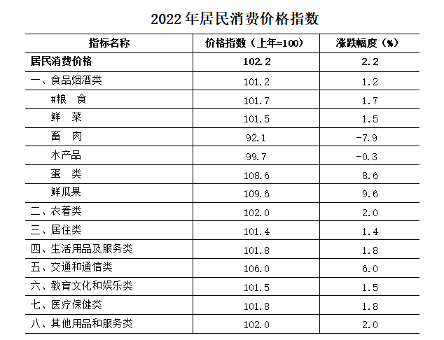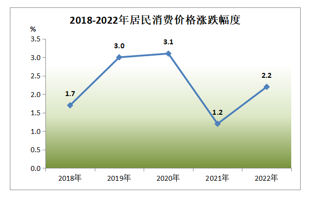 全年居民消费价格比上年上涨2.2%。分类别看,食品烟酒类价格上涨1.2%,衣着类价格上涨2.0%,居住类价格上涨1.4%,生活用品及服务类价格上涨1.8%,交通通信类价格上涨6.0%,教育文化娱乐类价格上涨1.5%,医疗保健类价格上涨1.8%,其他用品及服务类价格上涨2.0%。工业生产者出厂价格上涨2.8%,其中轻工业上涨2.9%,重工业上涨2.6%。商品零售价格上涨3.8%。