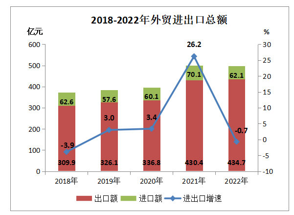 全年外贸进出口总额496.8亿元,比上年下降0.7%。其中,进口62.1亿元,下降11.5%;出口总额434.7亿元,增长1.1%。实际利用外资3.26亿元,增长9.5%。