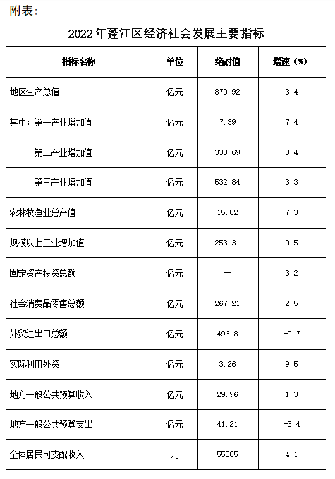 2022年,党的二十大胜利召开,是党和国家历史上极为重要的一年。蓬江始终坚持以习近平新时代中国特色社会主义思想为指导,全面贯彻党的二十大精神,坚决落实“疫情要防住、经济要稳住、发展要安全”的重要要求,抢抓粤港澳大湾区、深圳先行示范区和横琴、前海、南沙三大平台建设重大机遇,深入落实省委、省政府“1+1+9”工作部署,市委、市政府“1+6+3”工作安排和区委、区政府工作要求,抓产业、稳经济,着力推动经济社会高质量发展。