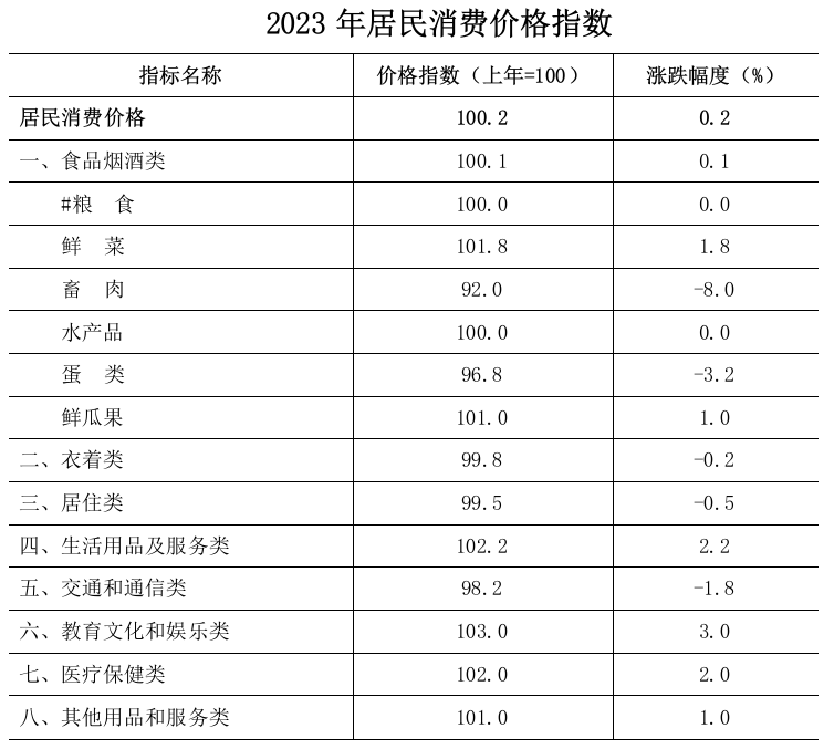 全年居民消费价格比上年上涨0.2%。分类别看,食品烟酒类价格上涨0.1%,衣着类价格下降0.2%,居住类价格下降0.5%,生活用品及服务类价格上涨2.2%,交通通信类价格下降1.8%,教育文化娱乐类价格上涨3.0%,医疗保健类价格上涨2.0%,其他用品及服务类价格上涨1.0%。工业生产者出厂价格下降1.1%,其中轻工业下降0.5%,重工业下降1.7%。