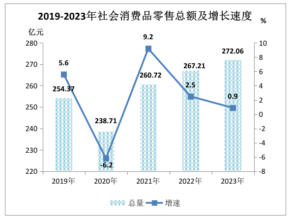 全年社会消费品零售总额272.06亿元,比上年增长0.9%。其中,限上批发和零售业零售额139.33亿元,下降5.1%;限上住宿和餐饮业零售额14.34亿元,增长18.3%。