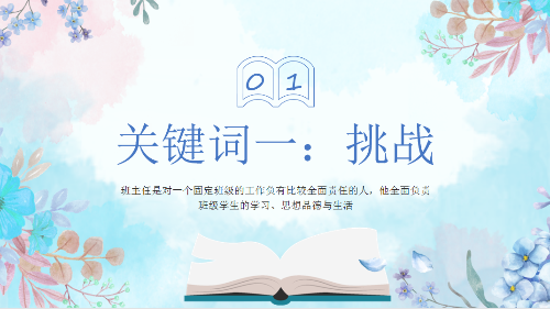 一、挑战。负责德育的行政对班主任们上一学期的辛勤工作给予了高度的评价和肯定,并鼓励班主任们勇于接受新的挑战。接着还详细讲解了近两周繁重的工作任务,让班主任们做好充分的开学准备,迎接新挑战。