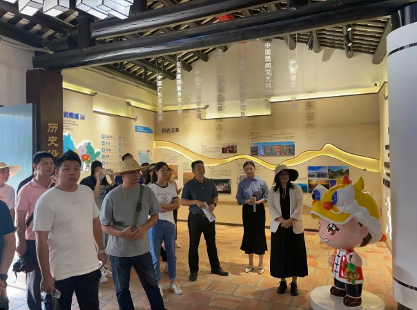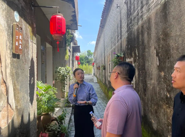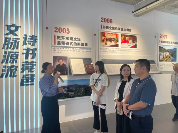 在官仓社区党群服务中心,调研组观看了“百千万工程”专题片,通过影像资料初步了解了社区在经济发展、乡村治理、人居环境整治等方面的进展与成效。在工作人员的带领下,调研组实地参观了该社区结合客家历史文化、樟木头“中国作家第一村”等元素,打造作家村实体部落的建设成效,学习社区在保留原有建筑风貌的基础上,合理规划艺术创作区、休闲文旅区、公共文化展演区、交流共享区等特色区域,推进作家书院、驻创基地、服务中心等配套设施同步建设,助力文化建设与乡村振兴双向赋能的经验做法。