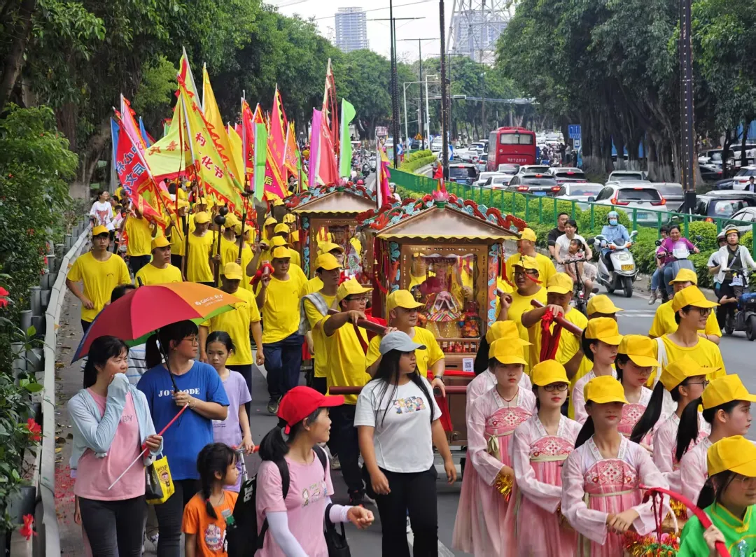 从天后宫到陈垣文化广场的2公里路上,500名群众簇拥追随,彩旗罗伞相映衬,鞭炮锣鼓齐争辉,棠下这座小镇沸腾了。那喧天锣鼓,既是古老习俗的脉搏,也是时代发展的足音。