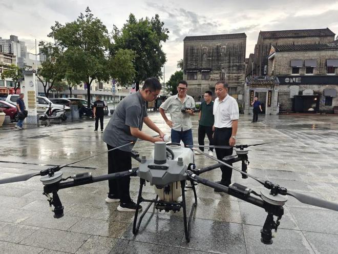 一架载着蚊虫消杀药水的无人机先后在长堤历史文化文化街区青年广场和启明里广场起飞,该无人机搭载智能喷洒系统,容量达70L,可自动调整飞行高度与控制喷药量,达到精准喷洒的效果。