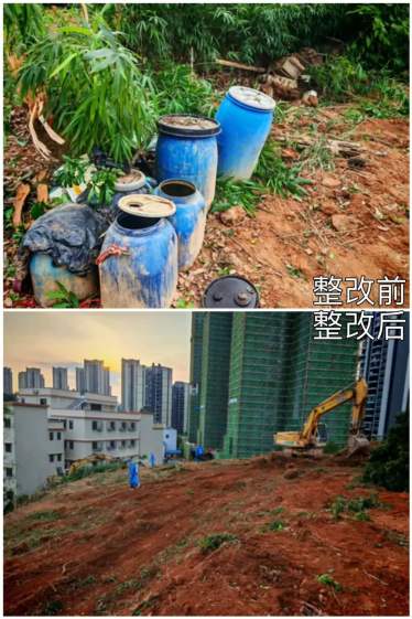 挖机不够?在周边爱心企业的支援下,3台钩机、4辆运土车开进现场,昼夜不停展开清理。为尽快完成整治,钩机师傅轮班作业,连续奋战,清运垃圾杂物,昔日杂草丛生的荒地变得开阔。