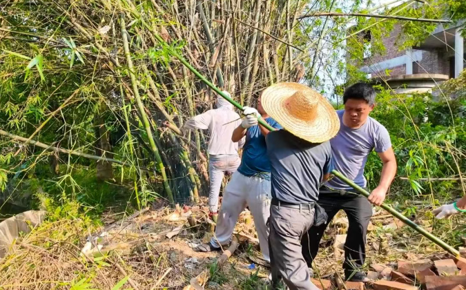 在蓝田村小组的村尾,一片曾被用作柴火囤积地的小竹林,如今正迎来新生。过去,这里枯枝败叶堆积,是出了名的“蚊虫窝”。记者近日前去走访,只见村民义工队的队员们正忙着清理,他们有的手持电锯切割老竹,有的用铁刀斩断杂枝。村民谢建业介绍,村里为清理工作做好了计划,例如安排消杀队提前完成喷药工作,未来还计划在竹林位置建设环村路,方便村民出行。