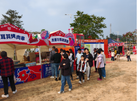 活动现场,以“棠下五洞牛肉”为核心的美食市集人头攒动,吸引着往来游客驻足品尝。